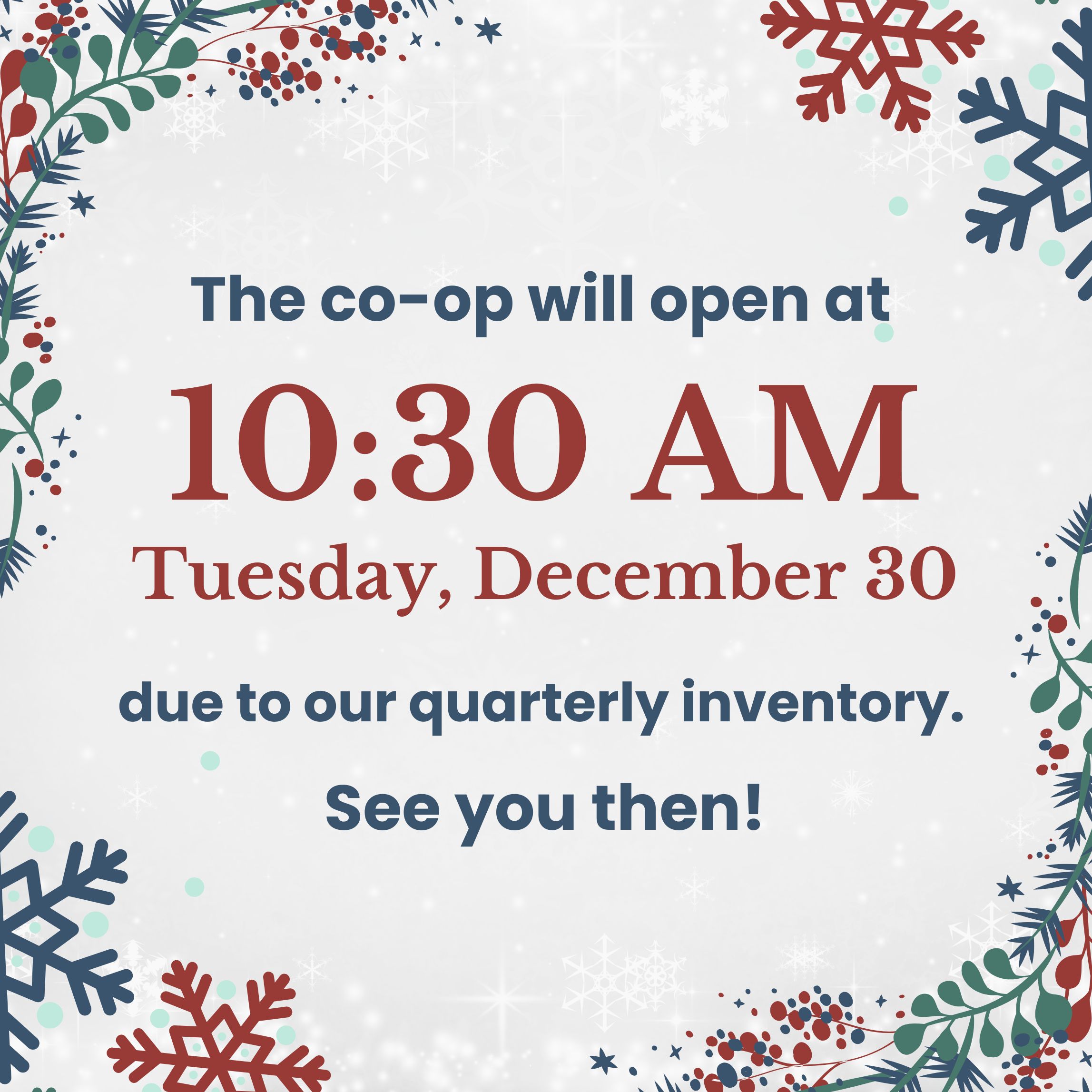 Co-op Opening at 10:30 AM Tuesday, December 30
