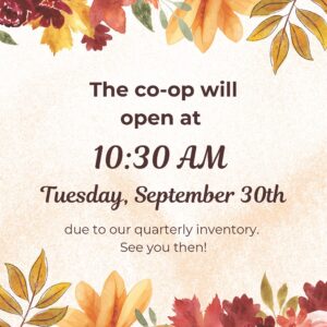 We will be opening later at 10:30am on September 30th to conduct inventory. Thank you for your understanding.